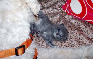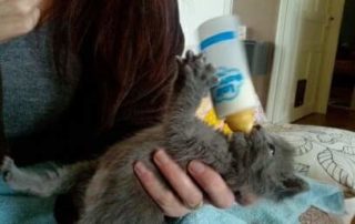 Je passe plusieurs coups de fils… et là je vois une forme grise tomber de très haut et atterrir sur une toute petite touffe d’herbe… Au départ j’ai cru que c’était un rat… En m’approchant je me rend compte qu’il s’agit d’un minuscule chaton gris. Je l’ai mis dans mon pull et direction chez la vétérinaire. Un vrai miracle, elle n’avait rien… Elle a survécu !!! Biberonnage toutes les 3 heures… Ça a été très dur vu son âge, (moins de 12 jours car elle avait les yeux fermés).