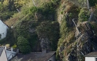 Après mon rendez-vous, je fais un petit tour vite fait au centre ville et en me dirigeant vers ma voiture, j’entends des cris stridents… Au départ je pense aux choucas (oiseaux qui ressemble à des corbeaux). Je décide de traverser la passerelle et là je me dis que ça ressemble à des cris de chats en détresse…. Je pense d’abord à un adulte… Et là je me rends compte que les cris viennent de très haut sur la falaise… Je panique un peu en me demandant comment je vais pouvoir intervenir à un endroit pareil…